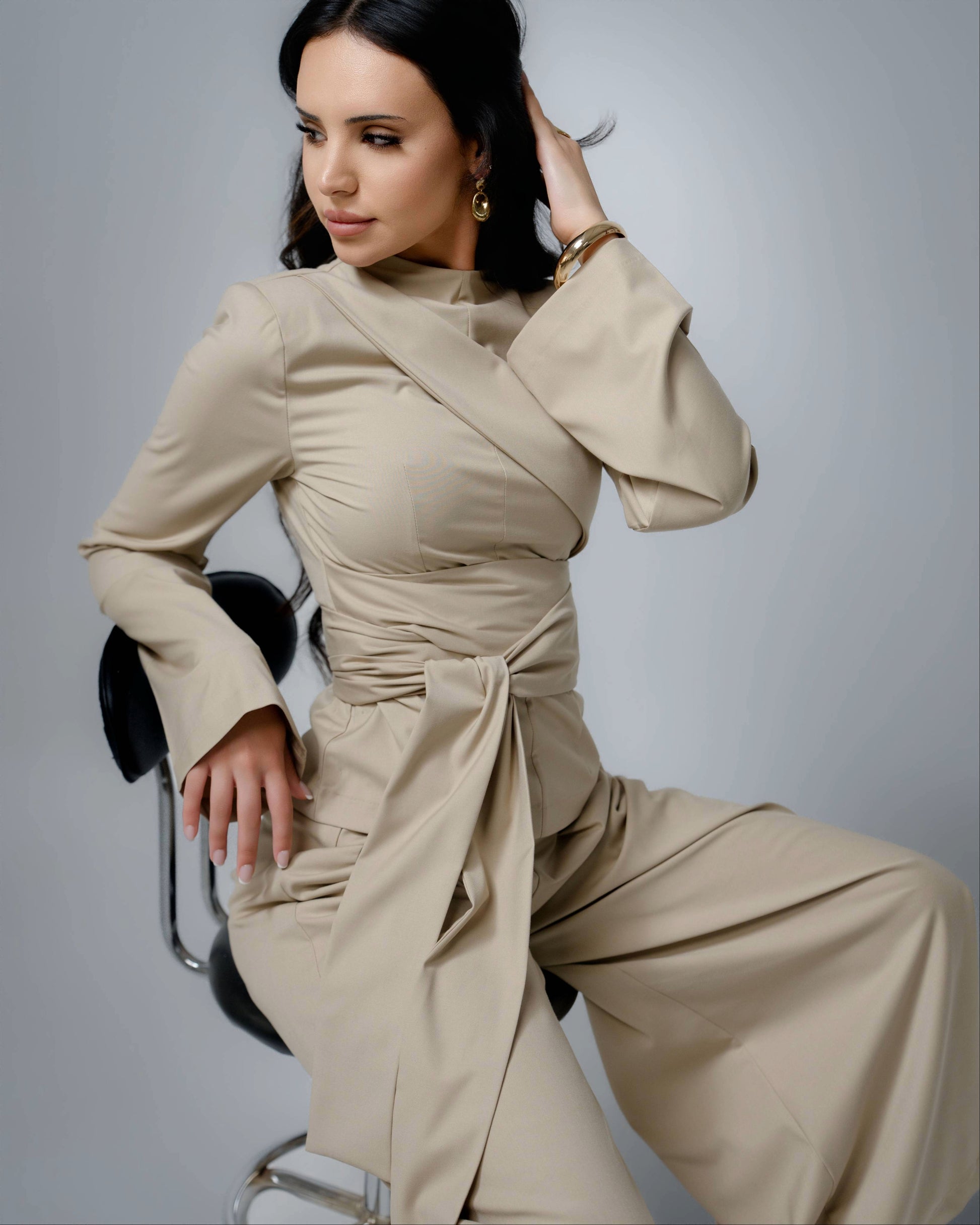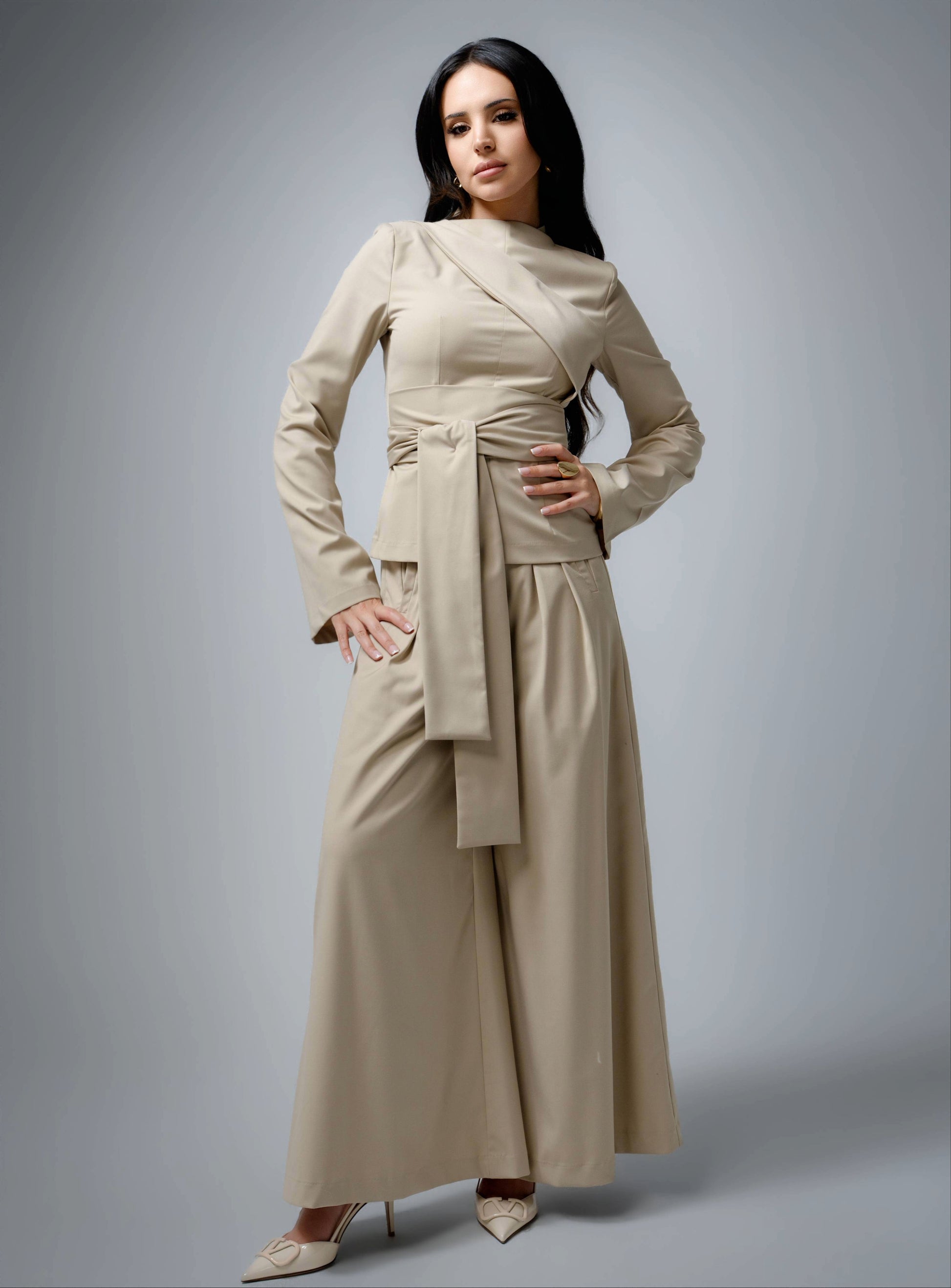 The standout wrap detail at the waist defines the silhouette beautifully, creating shape while adding subtle dimension. Paired with fluid wide-leg pants, the overall look feels balanced—structured on top, flowing through the bottom.