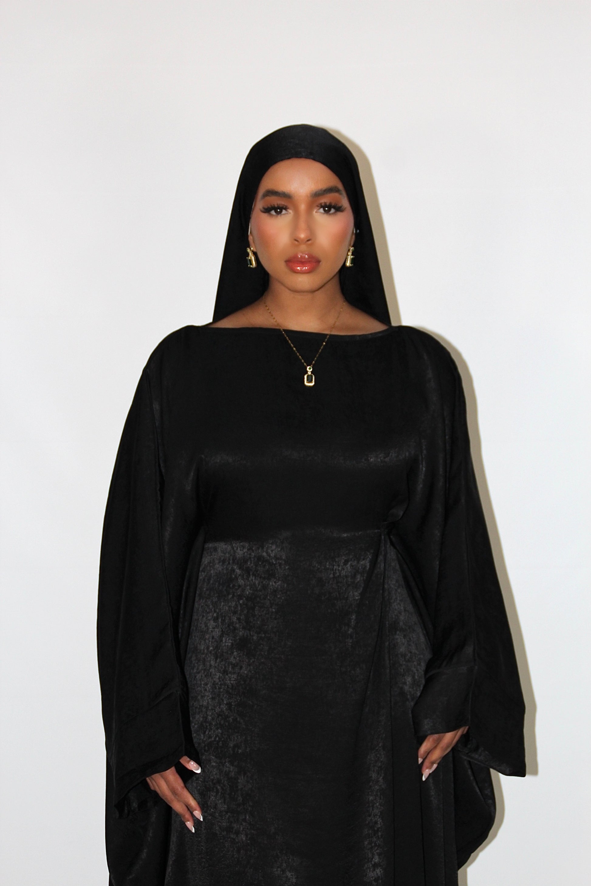 This luxurious soft silk velvet blended fabric is designed for both elegance and comfort. The SAMRA abaya features a flattering batwing sleeve design and an internal waist belt that can be tied or left loose. Paired with a matching hijab, this set allows versatile styling options to suit your preference.