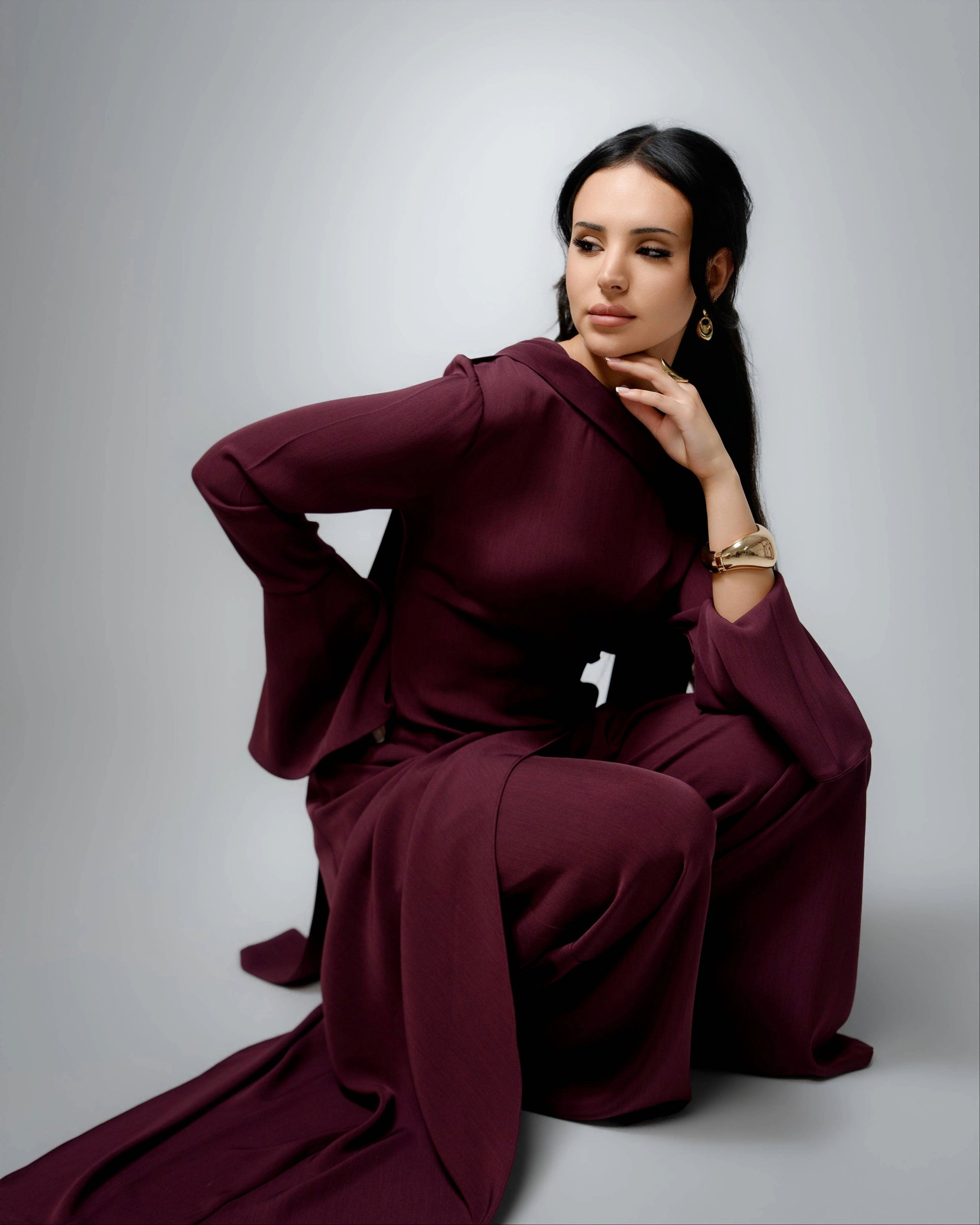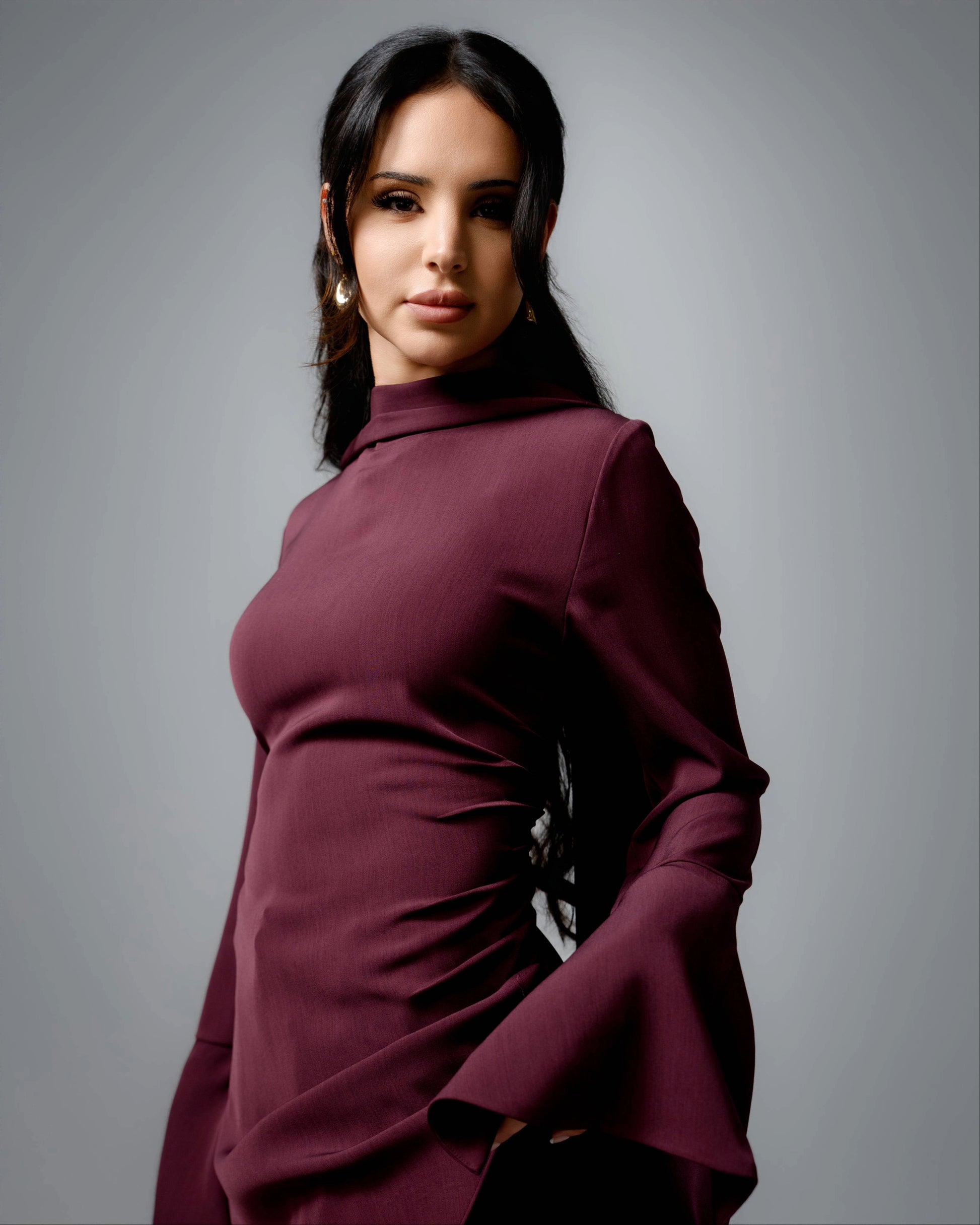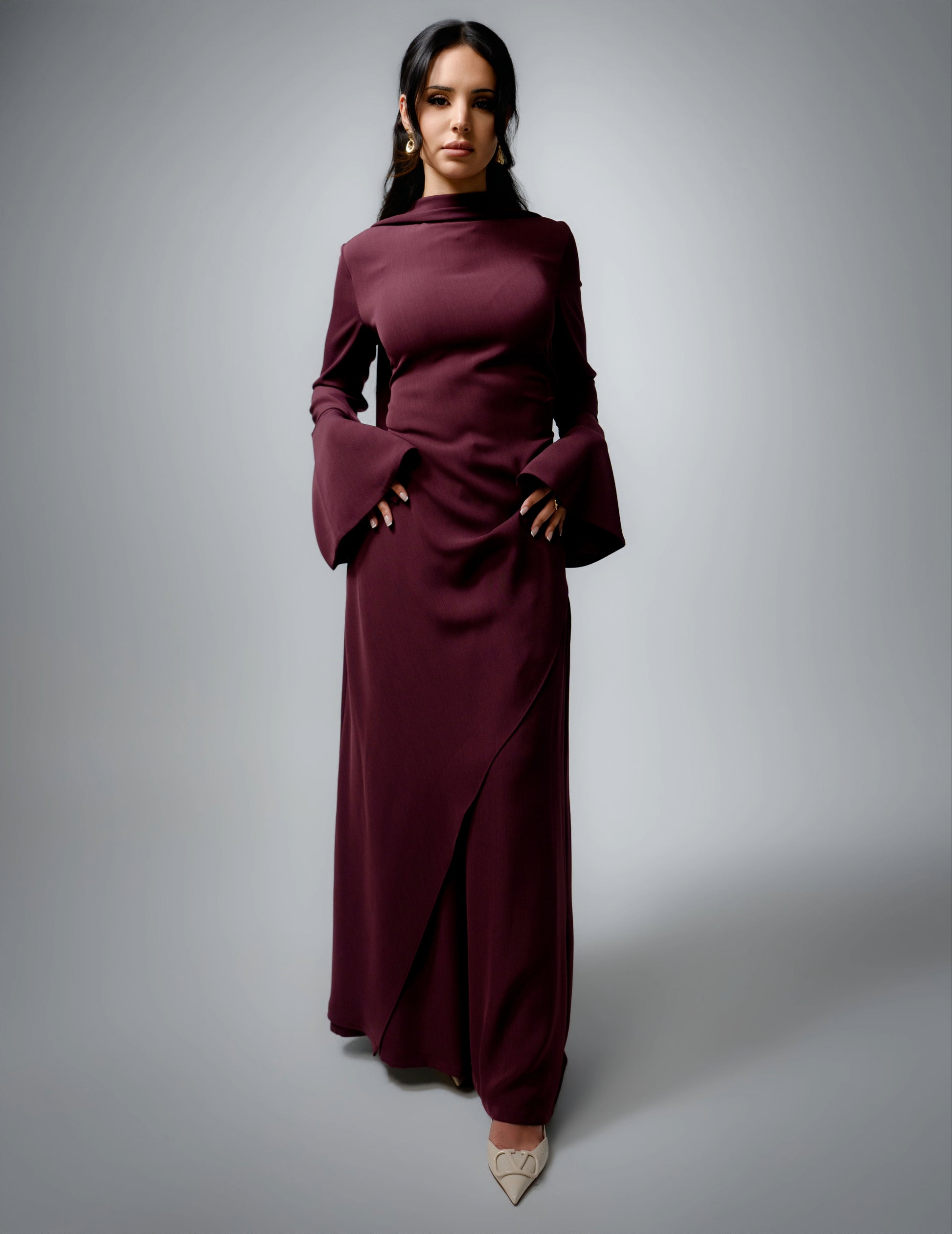 The soft drape at the neckline and the subtle waist shaping create a flattering silhouette, while the flared sleeves add movement and just the right amount of drama. The wide-leg pants fall smoothly, giving the whole look a relaxed yet elevated feel.